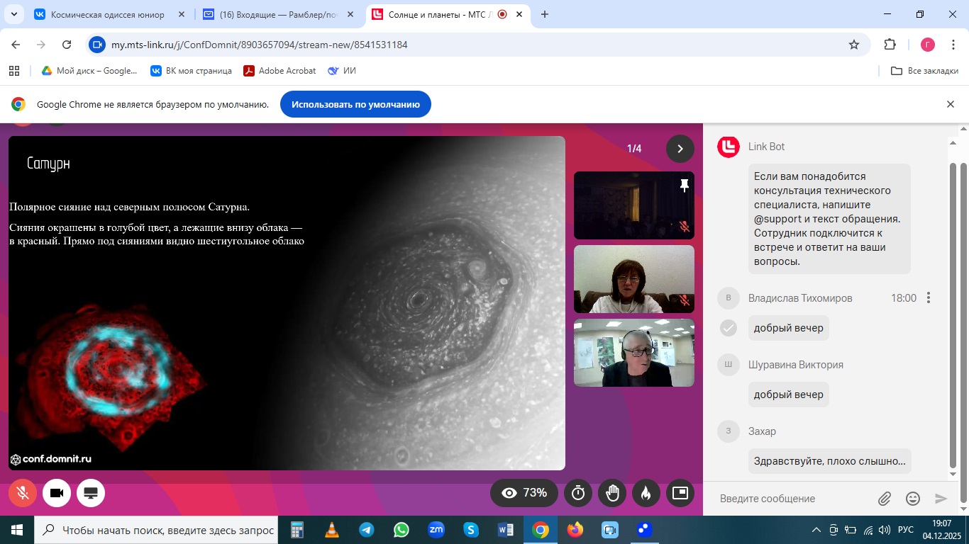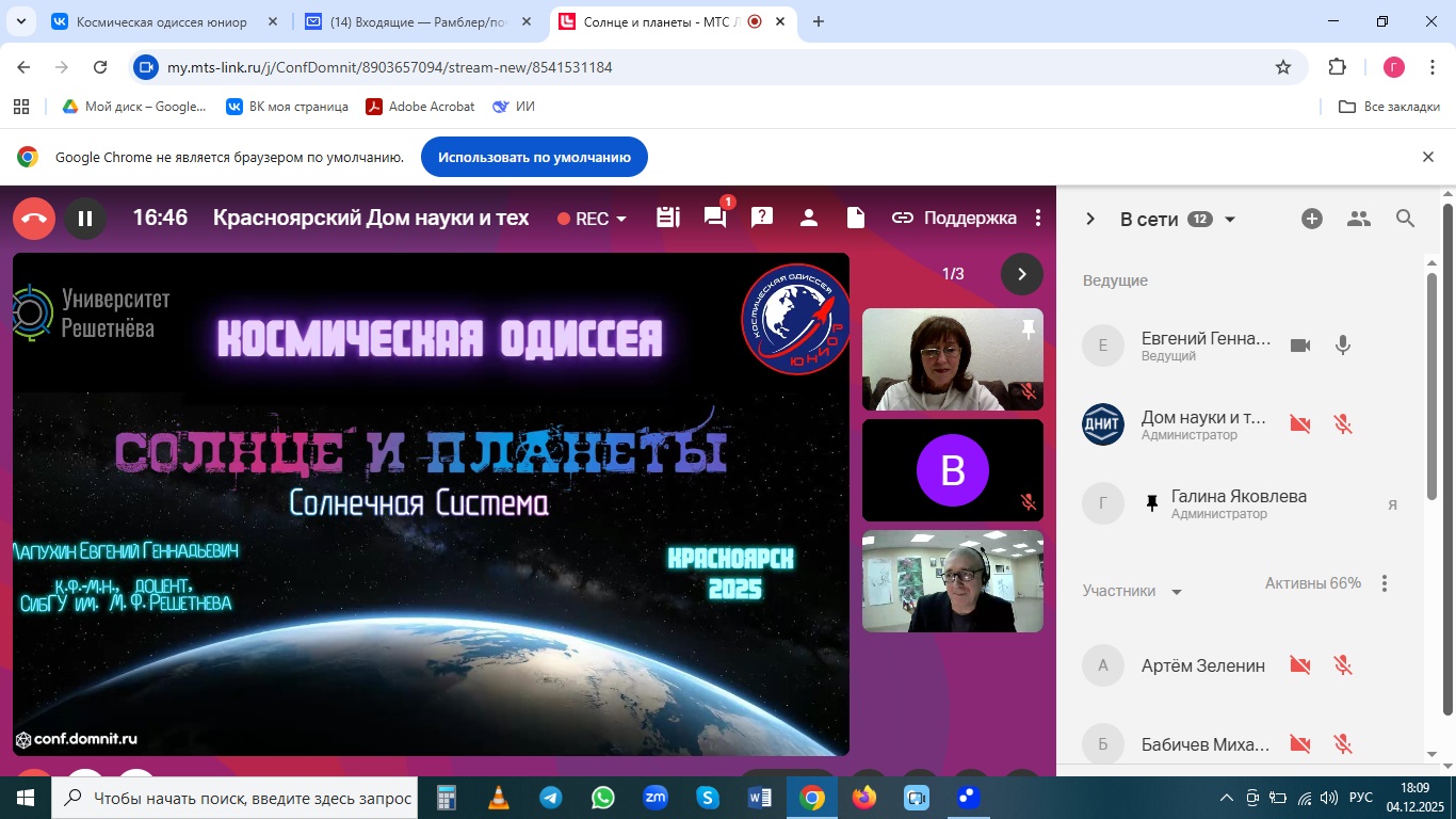 Может ли Юпитер стать звездой? Сколько длится год на Нептуне? Какая планета является рекордсменом по количеству спутников? На эти и многие другие вопросы участники проекта «Космическая одиссея юниор» получили ответы на вебинаре, который провел для них доцент Сибирского государственного университета науки и технологий имени М.Ф. Решетнева, кандидат физико-математических наук Евгений Лапухин.