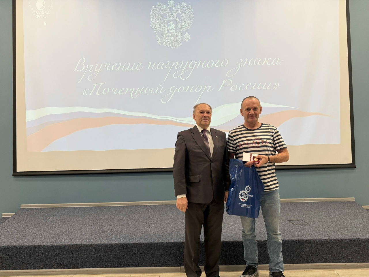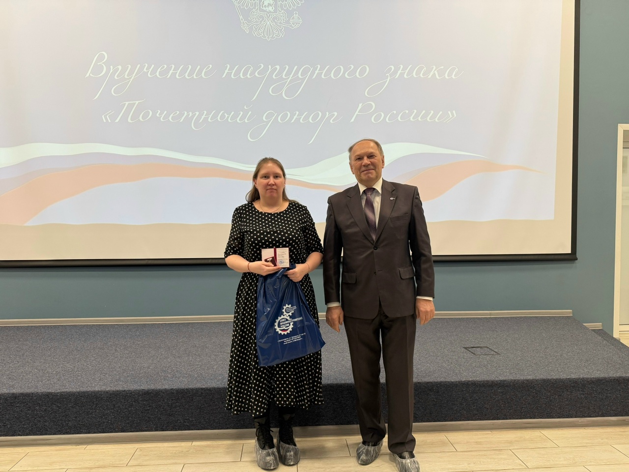 Заместитель председателя Красноярского регионального отделения СоюзМаш России Андрей Шаров поздравил обладателей знака, пожелал им крепкого здоровья и поблагодарил за великодушие, сострадание и чуткость к чужим проблемам, стремление помогать людям, сдавая кровь. Награжденным представителям предприятий СоюзМаш (работники АО «Красмаш» Кустова Н.С., Мамонтова И.С., Мартынова Т.Н; АО «РЕШЕТНЕВ» — Тихонов В.А.) Андрей Сергеевич дополнительно вручил фирменные подарочные наборы.