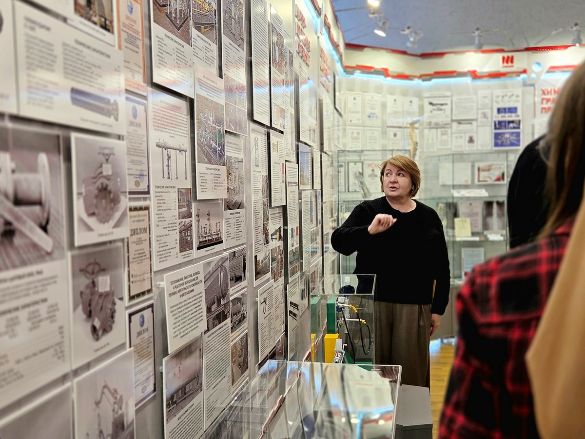 Знакомство с Красмашем началось для молодых людей с визита в выставочно-демонстрационный центр. Специалист музея провела для парней и девушек увлекательную экскурсию по историческим экспозициям. Студентам рассказали о ключевых этапах строительства завода, его первых руководителях, которые стояли у истоков производства и решали непростые задачи по организации труда и быта рабочих.