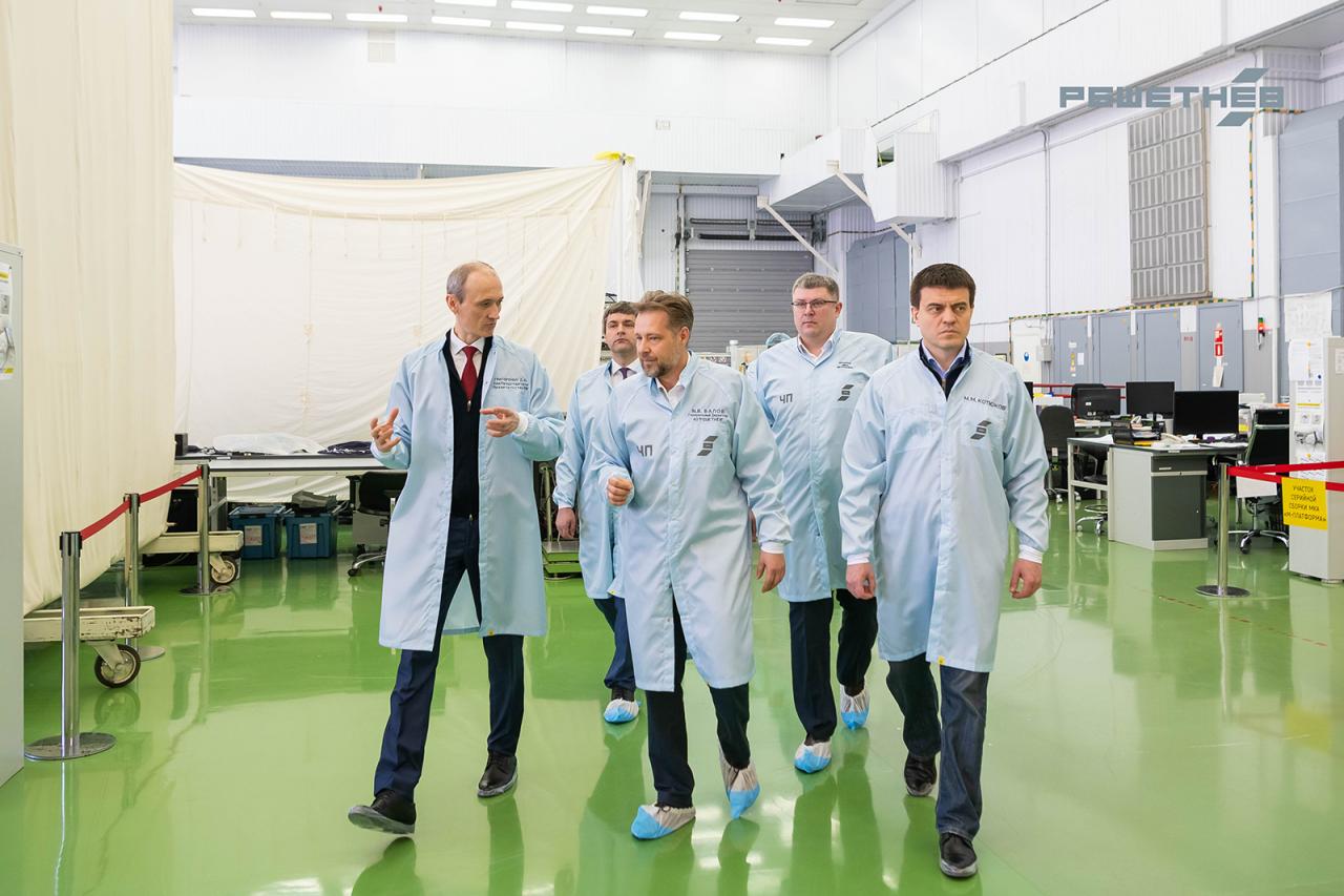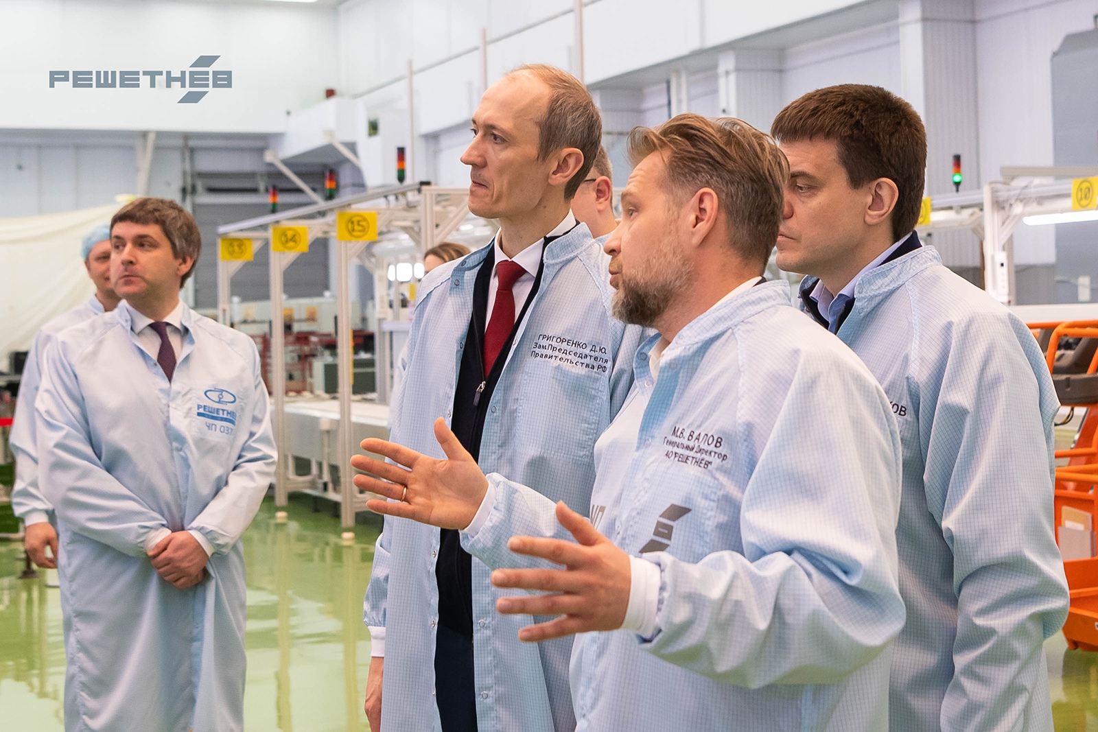 В состав делегации также вошли губернатор Красноярского края Михаил Котюков, министр цифрового развития Красноярского края Николай Распопин, заместитель генерального директора Госкорпорации «Роскосмос» Иван Данилов. Гости посетили новый антенный корпус, где находятся как конструкторские, так и производственные подразделения. «Мы специально разместили конструкторов в данном здании, чтобы замкнуть цикл по разработке, сборке, изготовлению и испытаниям полезных нагрузок. Это позволяет минимизировать временные затраты по созданию новых изделий», – пояснил генеральный директор АО «РЕШЕТНЁВ», член регсовета Красноярского РО СоюзМаш Михаил Валов. На данной площадке предусмотрено производство одновременно семи полезных нагрузок спутников связи. В частности, развёрнуты работы по проекту «Экспресс-РВ».