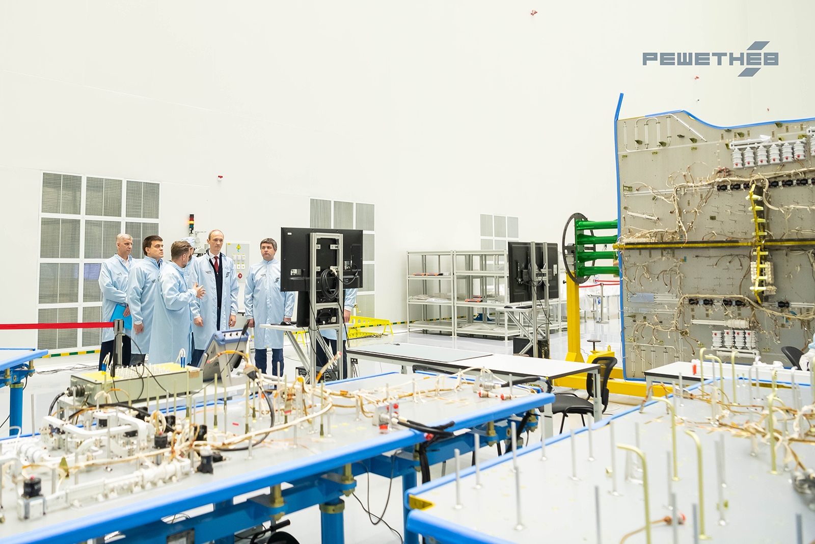 Также в корпусе размещаются места сборки полезных нагрузок для аппаратов «Луч-5ВМ», «Ямал-501», «Экспресс-АМУ4», «Экспресс-40» и «Экспресс-АМУ51». Михаил Валов рассказал вице-премьеру о цифровом развитии компании. Глава предприятия отметил, что на этапе сборки и проведения испытаний специалисты пользуются конструкторской документацией в электронном виде, 3Д-моделями изделий. В компании внедрён электронный документооборот, применяются различные базы данных. В промышленную эксплуатацию введён ряд модулей отечественной системы T-FLEX PLM. Руководитель предприятия подчеркнул, что вся эта деятельность направлена на реализацию национального проекта обеспечения технологического лидерства «Развитие космической деятельности Российской Федерации на период до 2030 года и на перспективу до 2036 года». В сборочном цехе спутникостроительной компании гостям продемонстрировали космические аппараты системы ГЛОНАСС. Также их познакомили с технологией машинного зрения, которая позволяет осуществлять контроль качества изделий.